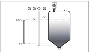 注:使用透鏡雷達液位計時,務必保證最高料位不能進入測量盲區(qū)(圖中1所示區(qū)域)。