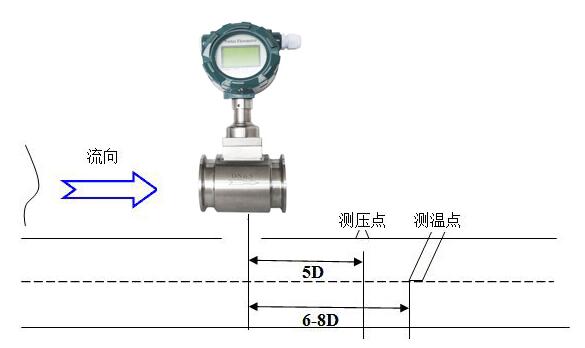 a)測壓孔和測溫孔的安裝設計。被測管道需要安裝溫度和壓力變送器時,測壓孔應設置在下游3-5D處,測溫孔應設置在下游6-8D處,見圖(七)。D為儀表工稱口徑,單位:mm