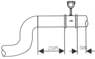 d)測量液體時,為了保證管內充滿液體,所以在垂直或傾斜管道安裝儀表時,應該保證液體流動方向從下而上。若管道內含少量氣體,為了防止氣體進入儀表測量管,儀表應安裝在管線的較低處如圖4b所示