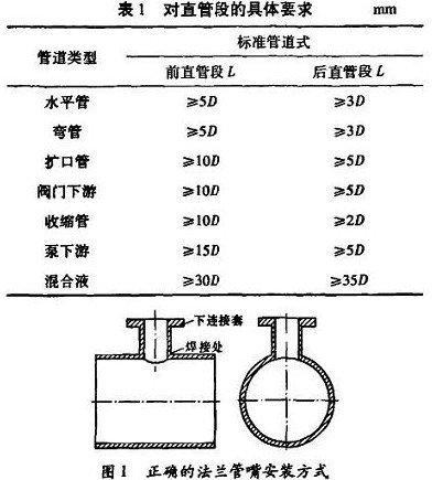 流體在方向、管徑以及閥門(mén)開(kāi)度變化時(shí),會(huì)產(chǎn)生渦流和流場(chǎng)畸變,這樣會(huì)對(duì)傳感器電極的測(cè)量產(chǎn)生影響,從而影響儀表的精度。所以要盡可能地離開(kāi)彎管、手閥、調(diào)節(jié)閥等部件一定距離,直管段的具體要求見(jiàn)表l。表中,D表示管道通徑,L表示傳感器到閥門(mén)或彎頭等部件的距離。