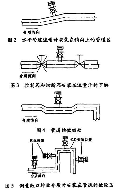 為了保障測(cè)量精度,傳感器應(yīng)避免在容易產(chǎn)生真空、氣體、渦流等地方安裝。傳感器與智能變送器之間的通訊電纜要避開(kāi)電動(dòng)機(jī)等強(qiáng)電設(shè)備。建議安裝在圖2一圖5所示位置。