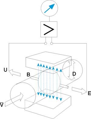 B-磁通密度;D-測量管內(nèi)徑;V-流量信號(電動勢);U-液體平均軸向流速