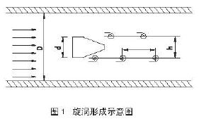渦街流量計工作原理是在流體中垂直的插入一根柱狀阻力體時,在其兩側(cè)就會交替的產(chǎn)生旋渦,隨著流體向下游方向運動,形成漩渦,成為卡曼渦街,見圖1。產(chǎn)生渦街的阻力體稱漩渦發(fā)生體。實踐證明,渦街流量計旋渦的頻率與流速成正比,可用下式表示: