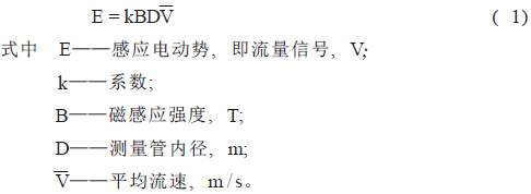 電磁流量計(jì)的基本原理是法拉第電磁感應(yīng)定律,即導(dǎo)體在磁場中切割磁力線運(yùn)動時(shí)在其兩端產(chǎn)生感應(yīng)電動勢。如圖1所示,導(dǎo)電性液體在垂直于磁場的非磁性測量管內(nèi)流動,與流動垂直的方向上產(chǎn)生與流量成比例的感應(yīng)電勢, 電動勢的方向按弗來明右手規(guī)則,其值如下式: