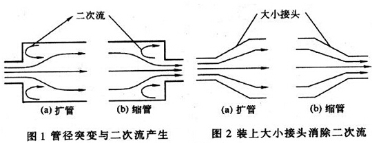 無(wú)論是變大還是變小,都會(huì)產(chǎn)生二次流動(dòng),干擾正常的流速分布。通常在遇到這類情況的時(shí)候,我們會(huì)為管道安裝合適的大小接頭,如圖2所示。為流體做合理過(guò)渡,使流速能夠恢復(fù)到正常狀態(tài),保證測(cè)量數(shù)據(jù)的準(zhǔn)確與穩(wěn)定。