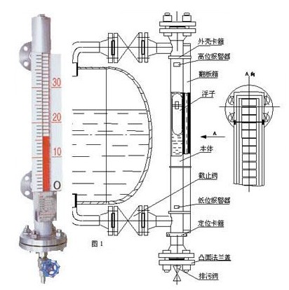 首先,讓我們來了解一下磁翻板液位計的結(jié)構(gòu):每一臺磁翻板液位計都有一個容納浮球的腔體,稱為主體管或外殼,它通過法蘭或其他接口與容器組成一個連通器;這樣它腔體內(nèi)的液面與容器內(nèi)的液面是相同高度的,所以腔體內(nèi)的浮球會隨著容器內(nèi)液面的升降而升降;在腔體的外面裝了一個翻柱顯示器,因為我們在制造浮球時在浮球沉入液體與浮出部分的交界處安裝了磁鋼,它與浮球隨液面升降時,它的磁性透過外殼傳遞給翻柱顯示器,推動磁翻柱翻轉(zhuǎn)180°;由于磁翻柱是有紅、白兩個半圓柱合成的圓柱體,所以翻轉(zhuǎn)180°后朝向翻柱顯示器外的會改變顏色,兩色交界處即是液面的高度。