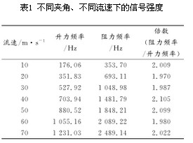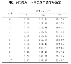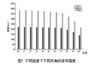 通過仿真模擬,圖4給出流速u=5m/s時(shí),作用在三角柱上的升力系數(shù)和阻力系數(shù)變化曲線。由圖5升力系數(shù)的FFT曲線可以看出其頻率為FL=87.92Hz。從圖6阻力系數(shù)的FFT曲線可以看出其頻率為FD=176.43Hz,約為升力系數(shù)變化頻率的2倍。 為了驗(yàn)證將FLUENT用于渦街流量計(jì)的三維流場(chǎng)仿真的可行性,對(duì)不同流速下的升、阻力頻率進(jìn)行比較,如表1所示。可以看出阻力系數(shù)變化頻率是升力系數(shù)變化頻率的2倍,說明用FLUENT進(jìn)行渦街流量計(jì)的三維仿真是可行的。 4 仿真結(jié)果 基于上述通過升、阻力變化頻率的關(guān)系驗(yàn)證出利用FLUENT對(duì)三維渦街流場(chǎng)進(jìn)行仿真是可行的。本節(jié)應(yīng)用FLUENT對(duì)截流夾角、流速和信號(hào)強(qiáng)度之間的關(guān)系進(jìn)行了仿真研究。分別取7m/s、40m/s和70m/s的流速α的角度在0°~10°范圍內(nèi)取值(發(fā)生體的安裝偏差一般不會(huì)超過10°),進(jìn)行數(shù)值仿真。記錄信號(hào)強(qiáng)度,如表2所示。 將表2的數(shù)據(jù)繪制成圖7,將圖7中流速為7m/s的數(shù)據(jù)放大如圖8所示。觀察圖7、8,可以直觀的反應(yīng)出夾角、流速與信號(hào)強(qiáng)度的關(guān)系變化。通過對(duì)比這3張圖可以看出,信號(hào)強(qiáng)度隨著夾角、流速的不同而不同。并從圖中得出結(jié)論: 1)渦街的信號(hào)強(qiáng)度與流速成正比,隨著流速的增加,旋渦脫落頻率信號(hào)強(qiáng)度會(huì)顯著增加。 2)在流速相同的情況下,隨著夾角的增大,信號(hào)強(qiáng)度逐漸減小,并隨著夾角的增大,信號(hào)強(qiáng)度的衰減程度也逐漸增大。夾角在1°~7°范圍,對(duì)信號(hào)強(qiáng)度的衰減影響不大,可忽略,超過7°以后對(duì)信號(hào)強(qiáng)度影響變大,不可忽略。 3)在夾角相同的情況下,隨著流速的增大,信號(hào)強(qiáng)度衰減趨勢(shì)越來越明顯。 5 結(jié)論 流場(chǎng)仿真在渦街流量計(jì)的設(shè)計(jì)和完善中正變得越來越重要,它通過理論支持指導(dǎo)仿真的可實(shí)施性,并將仿真結(jié)論用于實(shí)驗(yàn)中,提高效率。通過模擬三維渦街流場(chǎng)三角柱繞流現(xiàn)象,將升、阻力頻率進(jìn)行對(duì)比,驗(yàn)證了可將FLUENT用于三維渦街流場(chǎng)的仿真中。并從不同流速和不同截流夾角兩方面分別考慮,對(duì)比分析了三維渦街信號(hào)的信號(hào)強(qiáng)度,得出夾角在1°~7°范圍,對(duì)信號(hào)強(qiáng)度的影響不大,超過了7°以后影響變大。從而為以后的實(shí)驗(yàn)做出理論指導(dǎo)。進(jìn)一步的研究可以通過對(duì)不同形狀的旋渦發(fā)生體取不同截流夾角和不同流速進(jìn)行仿真對(duì)比研究。