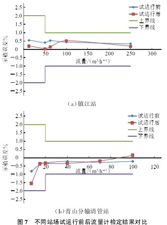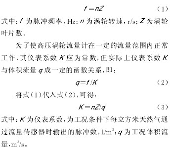天然氣作為一種高效清潔能源,其需求量隨著全球低碳經(jīng)濟(jì)的發(fā)展呈現(xiàn)快速增長(zhǎng)趨勢(shì),預(yù)計(jì)2020 年國(guó)內(nèi)天然氣需求量將達(dá) 3 000×108m3[1-4]。進(jìn)口渦輪流量計(jì)一直占據(jù)著高壓管道貿(mào)易計(jì)量市場(chǎng),而國(guó)產(chǎn)渦輪流量計(jì)通常應(yīng)用于低壓管道,用戶主要為城市燃?xì)獾墓I(yè)用戶。 隨著工業(yè)過程控制自動(dòng)化的實(shí)施及輸氣管道的大量建設(shè),對(duì)貿(mào)易計(jì)量所需的渦輪流量計(jì)和具有強(qiáng)大功能的流量計(jì)算機(jī)的需求量也不斷增大,因此,擁有自主知識(shí)產(chǎn)權(quán)且滿足工業(yè)性應(yīng)用要求的精度好的高壓渦輪流量計(jì)與流量計(jì)算機(jī),對(duì)實(shí)現(xiàn)管道設(shè)備的國(guó)產(chǎn)化,打破國(guó)外技術(shù)壟斷,保障管道安全、經(jīng)濟(jì)、高效運(yùn)行,具有十分重要的意義。為了評(píng)價(jià)國(guó)產(chǎn)化流量計(jì)在實(shí)際運(yùn)行過程中的準(zhǔn)確度、可重復(fù)性、穩(wěn)定性及安全性等指標(biāo),為后續(xù)新建管道的推廣應(yīng)用及流量計(jì)的制造、改進(jìn)提供依據(jù),對(duì) 4 臺(tái)國(guó)產(chǎn) 氣體高壓渦輪流量計(jì)和FC 型流量計(jì)算機(jī)進(jìn)行了現(xiàn)場(chǎng)工業(yè)性試驗(yàn)。 1 高壓氣體渦輪流量計(jì) 1.1 工作原理 高壓氣體渦輪流量計(jì)是一種帶機(jī)械計(jì)數(shù)器并用于準(zhǔn)確測(cè)量氣體流量的流量計(jì),其工作原理:當(dāng)高壓氣流進(jìn)入流量計(jì)時(shí),首先經(jīng)過整流器整流并加速,在流體的作用下,渦輪克服阻力矩開始轉(zhuǎn)動(dòng);當(dāng)力矩達(dá)到平衡時(shí),渦輪轉(zhuǎn)速穩(wěn)定,此時(shí)其轉(zhuǎn)速與氣體工況流量成正比,并通過齒輪減速傳動(dòng);磁耦合聯(lián)接驅(qū)動(dòng)字輪計(jì)數(shù)器轉(zhuǎn)動(dòng),直接累積氣體的工況體積總量。 因?yàn)橥ㄟ^渦輪的流量與渦輪轉(zhuǎn)速成正比,所以高頻信號(hào)脈沖輸出頻率與渦輪轉(zhuǎn)速存在以下關(guān)系[7]: 綜上所述,儀表系數(shù)K 除與渦輪導(dǎo)程、葉片數(shù)、葉片寬度、螺旋升角、流量計(jì)流體通道等結(jié)構(gòu)因素有關(guān)外,還與介質(zhì)流體黏性、軸承本身阻尼、軸承潤(rùn)滑油黏度等有關(guān),若以上其中一種或幾種相關(guān)因素發(fā)生改變,則儀表系數(shù)K 也會(huì)相應(yīng)改變,因此流量計(jì)應(yīng)通過線性檢定等試驗(yàn)方式進(jìn)行最終設(shè)計(jì)確認(rèn)。 1.2 性能測(cè)試 以 EN 12261-2002《Gas meters - Turbine gasmeters》[8]和 OIML R137-1-2006《氣體流量計(jì)》作為流量計(jì)產(chǎn)品的研制依據(jù),并嚴(yán)格按照標(biāo)準(zhǔn)進(jìn)行性能測(cè)試,主要包括:耐久性試驗(yàn)、彎矩與扭矩試驗(yàn)、短時(shí)過載試驗(yàn)、擾動(dòng)試驗(yàn)以及高低溫性能測(cè)試等。 1.2.1 耐久性測(cè)試 渦輪流量計(jì)進(jìn)行耐久性測(cè)試的目的在于確認(rèn)流量計(jì)在指定條件下的計(jì)量性能是否符合分段要求[9],即: 確認(rèn)各種安裝位置是否影響測(cè)試樣機(jī)的計(jì)量性能,安裝位置可分為水平方向、垂直向上與垂直向下。在不同安裝位置情況下,樣機(jī)在耐久性測(cè)試前后指示誤差的變化量不得超過式(4)要求值的 1/3。 以 DN80-G100 樣機(jī)為例,進(jìn)行耐久性測(cè)試說明。首先將 3 臺(tái)樣機(jī)分別安裝在同一管道的不同位置,管道內(nèi) 0.8 MPa 壓縮氣體以樣機(jī)最大流量進(jìn)行循環(huán)運(yùn)行,以每 1 000 h 為運(yùn)行單位,將樣機(jī)拆卸并在標(biāo)準(zhǔn)氣體流量裝置上進(jìn)行相應(yīng)性能測(cè)試,得到 7 000 h 運(yùn)行測(cè)試數(shù)據(jù)(圖 1)。 結(jié)果表明:該測(cè)試樣機(jī)滿足耐久性測(cè)試要求,指示誤差的變化量未超過最大允許誤差的 1/3;軸承經(jīng)過長(zhǎng)時(shí)間運(yùn)行磨合更趨于穩(wěn)定,長(zhǎng)期運(yùn)行后非線性段更趨于理想特性曲線。 1.2.2 彎扭矩測(cè)試 對(duì)于高壓渦輪流量計(jì),應(yīng)該詳細(xì)說明流量計(jì)所需的彎曲與扭力力矩的保護(hù)水平[2]。該數(shù)據(jù)可以通過試驗(yàn)直接獲得(圖 2,其中直管段 1 連接氣體流量標(biāo)準(zhǔn)裝置,圖 2a 中在直管段 2 預(yù)先確定的力臂L 位置附加垂直方向的力F 而形成彎矩M;圖 2b 中在直管段 2 側(cè)面預(yù)先確定的力臂L 位置附加垂直方向的力F 而形成扭矩T,而彎矩與扭矩均是作用于流量計(jì)入口與出口法蘭處)。由于該項(xiàng)測(cè)試主要是針對(duì)流量計(jì)強(qiáng)度的校核,為了使測(cè)試結(jié)果更具說服力,并且提高其可靠性,將鋁合金殼體的中低壓渦輪流量計(jì) DN80-G100 用于此次測(cè)試。測(cè)試過程中按照 EN 12261-2002 表 10中要求施加 1 倍、2 倍直至 4 倍(即力矩為 3 040 N·m)的砝碼F,未發(fā)現(xiàn)流量計(jì)殼體有任何異常變化。施加砝碼F 時(shí)及卸下砝碼之后得到的指示誤差與施加砝碼F 之前的指示誤差無明顯變化,實(shí)際變化量均在最大允許誤差的 1/3 以內(nèi)。 1.2.3 常壓與高壓試驗(yàn)對(duì)比 為了確認(rèn)高壓渦輪流量計(jì)在高壓氣體介質(zhì)中計(jì)量性能是否滿足工業(yè)貿(mào)易計(jì)量要求,將多臺(tái) DN80-G160樣機(jī)發(fā)往國(guó)家石油
