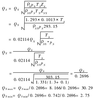 式中:ZS(ZSN)為被測氣體在標準狀態(tài)(工作狀態(tài))下壓縮系數(shù)(一般情況ZSUZSN);QS為工況下氧氣的實際流量;QN為標況下空氣的實際流量;QN為標況下空氣的密度(11293kg/m3);pN為標準大氣壓;TN為標準溫度293115K;QSN為標況下氧氣的密度(即Q20);pS為氧氣實際工作壓力(即p1);TS為氧氣實際工作溫度(即T1)。