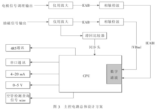 0引言 挖泥船電磁流量計(jì)用來指導(dǎo)挖泥船操作施工,防止堵管、悶耙,與密度測(cè)量設(shè)備一起使用構(gòu)成產(chǎn)量計(jì),為施工操作與管理提供決策數(shù)據(jù),有利于提高施工效率。其測(cè)量介質(zhì)為液固兩相流體,有別于通常意義下的單一介質(zhì),測(cè)量難度大大增加。而電磁流量計(jì)(EMF)是根據(jù)電磁感應(yīng)定律制成的一種測(cè)量導(dǎo)電性流體流量的儀表[1]。與現(xiàn)有各種流量?jī)x表相比,其直線性好、測(cè)量精度高、測(cè)量范圍和適用范圍廣、耐腐蝕性能強(qiáng),可以解決其他流量計(jì)不易解決的問題,如臟污流、腐蝕流等的測(cè)量[2]。 目前國(guó)內(nèi)應(yīng)用于挖泥船的電磁流量計(jì)大多存在零點(diǎn)漂移、轉(zhuǎn)換精度不高、流速不穩(wěn)、空管檢測(cè)易失常等諸多問題。對(duì)此,我們進(jìn)行了相關(guān)研究并提出相應(yīng)改進(jìn)措施,現(xiàn)已研發(fā)出一種專門用于挖泥船的電磁流量計(jì),在耙吸式挖泥船上成功應(yīng)用,取得了很好的效果。本文通過信號(hào)處理和空管檢測(cè)功能詳細(xì)介紹該新型挖泥船電磁流量計(jì)。 1電磁流量計(jì)工作原理 電磁流量計(jì)分為傳感器和轉(zhuǎn)換器兩部分。傳感器是把流過管道內(nèi)的導(dǎo)電流體的流速信號(hào)轉(zhuǎn)換為電信號(hào),轉(zhuǎn)換器是把傳感器輸出的電信號(hào)進(jìn)行有用信號(hào)識(shí)別提取并進(jìn)行相關(guān)處理,用于主機(jī)顯示,主要由勵(lì)磁電路、信號(hào)調(diào)理電路、微處理電路等部分組成。圖1為傳感器工作原理示意圖。 根據(jù)法拉第電磁感應(yīng)定律,當(dāng)一導(dǎo)體在磁場(chǎng)中運(yùn)動(dòng)而切割磁力線時(shí),在導(dǎo)體兩端便會(huì)產(chǎn)生感應(yīng)電動(dòng)勢(shì)。設(shè)在均勻磁場(chǎng)中,垂直于磁場(chǎng)方向有一個(gè)直徑為D的管道。管道由不導(dǎo)磁材料制成,內(nèi)表面加絕緣襯里。當(dāng)導(dǎo)電的液體在管道中流動(dòng)時(shí),導(dǎo)電液體就切割磁力線,因而在磁場(chǎng)及流動(dòng)方向垂直的方向?qū)a(chǎn)生感應(yīng)電動(dòng)勢(shì)。如果在管道截面垂直于磁場(chǎng)的直徑兩端安裝一對(duì)電極,只要管道內(nèi)流速υ為軸對(duì)稱分布,兩極之間就會(huì)產(chǎn)生感應(yīng)電動(dòng)勢(shì)[3],此感應(yīng)電動(dòng)勢(shì)與流速具有線性關(guān)系。其表達(dá)式為: E=K·B·D·V(1) 式中:V為測(cè)量管道內(nèi)截面上的平均流速(m/s); K為儀表常數(shù); D為測(cè)量管內(nèi)直徑(m); B為磁感應(yīng)強(qiáng)度(T)。 轉(zhuǎn)換器將此感應(yīng)電動(dòng)勢(shì)測(cè)出,再根據(jù)線性關(guān)系式即可得出流速信號(hào)。圖2為電磁流量計(jì)整體設(shè)計(jì)示意圖。 考慮到傳感器出來的微弱信號(hào)容易在傳輸線上損耗,故而電極信號(hào)調(diào)理板和空管檢測(cè)功能板就近放置于傳感器出線口,調(diào)理后經(jīng)屏蔽線傳輸至轉(zhuǎn)換器上的主控電路。 結(jié)構(gòu)上管道本身就是個(gè)大的屏蔽體,防止勵(lì)磁線圈磁場(chǎng)泄露,信號(hào)采用屏蔽線傳輸,減少線與線之間信號(hào)干擾,以及空間傳播的干擾,保證信號(hào)的完整性。 電路上采用雙核主從式控制,方便流速測(cè)量及其空管檢測(cè),克服了以往電磁流量計(jì)需要配合密度計(jì)來使用的缺陷;同時(shí)利用微機(jī)技術(shù),使其各方面性能大大提高,更加智能化,更加便于管理施工。 2勵(lì)磁方式的合理選擇 目前國(guó)產(chǎn)挖泥船流量計(jì)大多采用低頻方波勵(lì)磁方式,其主要特點(diǎn)是能避免零點(diǎn)漂移及無正交干擾,抗同相干擾能力較好[4]。但對(duì)于液固兩相流體而言,當(dāng)固體顆粒撞擊電極,表面電位變化形成尖峰狀噪聲,信號(hào)呈現(xiàn)大幅度波動(dòng)。而低頻方波勵(lì)磁不能從硬件技術(shù)上消除這種由于沖擊造成的干擾,要實(shí)現(xiàn)測(cè)量結(jié)果的穩(wěn)定,只能通過調(diào)整勵(lì)磁頻率外加軟件手段加以消除,但有兩方面的缺陷: (1)挖泥船上工況復(fù)雜,挖泥工況與合適勵(lì)磁頻率匹配問題很難完美解決,只能通過現(xiàn)場(chǎng)不斷調(diào)試較合適的頻率參數(shù)。同一工地不同土質(zhì)都需要改變頻率參數(shù),以目前的現(xiàn)場(chǎng)條件及技術(shù)水平,要做到這一步非常困難,目前基本上采用大體上可測(cè)量的單一頻率。 (2)采用軟件濾波降低由沖擊噪聲產(chǎn)生的波動(dòng)幅度,波動(dòng)幅度平滑程度越高,則測(cè)量結(jié)果的真實(shí)性和實(shí)時(shí)性就越差,很多情況下會(huì)導(dǎo)致測(cè)量結(jié)果失真,尤其當(dāng)高流速、固體含量高、大顆粒的工況。 而采用工頻(50Hz)電源交流勵(lì)磁方式,消除了電極表面的極化于擾,抗固體顆粒撞擊電極形成尖峰狀噪聲能力強(qiáng)。由于磁場(chǎng)是交變的,所以輸出信號(hào)也是交變信號(hào),放大和轉(zhuǎn)換低電平的交流信號(hào)要比直流信號(hào)容易得多。但值得注意的是,用交流勵(lì)場(chǎng)會(huì)帶來一系列的電磁干擾問題。例如正交干擾、同相干擾等,這些干擾信號(hào)與有用的流量信號(hào)混雜在一起。因此,如何正確區(qū)分流量信號(hào)與干擾信號(hào),并如何有效地抑制和排除各種干擾信號(hào),就成為