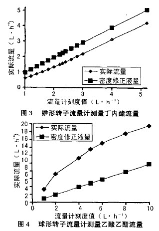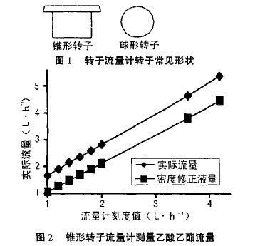轉(zhuǎn)子流量計常見的轉(zhuǎn)子形狀如圖1所示,左邊圖形的轉(zhuǎn)子用廣泛,為錐形轉(zhuǎn)子;右邊的圖形為圓珠形,為球形轉(zhuǎn)子。用這兩種轉(zhuǎn)子流量計,經(jīng)過測量,得到下列較為幾個典型的圖例。在錐型轉(zhuǎn)子流量計中,粘度為0.52mpa.s、密度為900kg·m-3’的液體乙酸乙醋的實測結(jié)果見圖2,粘度為1.gmPa·s、密度為1050kg·m-3的丁內(nèi)醋的實測結(jié)果見圖3,圖中所示的密度修正流量曲線指的是僅以密度進行修正的曲線,其修正公式為。