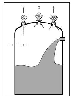 - 不能安裝在中心位置(3),如果安裝在中央,會(huì)產(chǎn)生多重虛假回波,干擾回波會(huì)導(dǎo)致信號(hào)丟失。