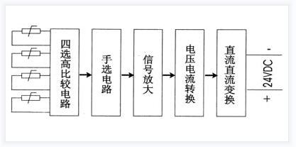 多路溫度遠(yuǎn)傳監(jiān)測儀是一臺最多支持四路輸入、自動選擇最大一路的4-20mA二線制輸出的信號隔離轉(zhuǎn)換器,它可就近安裝在測量點附近 ,二線制輸出同時作為信號傳輸和儀表的供電電源線.4~20mA輸出電流分為兩個部分,恒定的4mA電流作為測量零點,同時又是儀表電子線路的供電電流,而疊加在4mA上的0~16mA變化的電流是正比于被測量輸入信號的變化,例:0~150℃測量信號對應(yīng)于4~20mA的電流信號輸出.熱電阻/熱電偶傳感器的測量信號通過輸入電路(選擇高信號)或選點輸入電路選中某一路信號,該信號通過放大和電壓/電流(V/I)轉(zhuǎn)換單元將放大器的輸出電壓轉(zhuǎn)換為4~20mA恒定電流輸出,原理框圖如下圖所示: